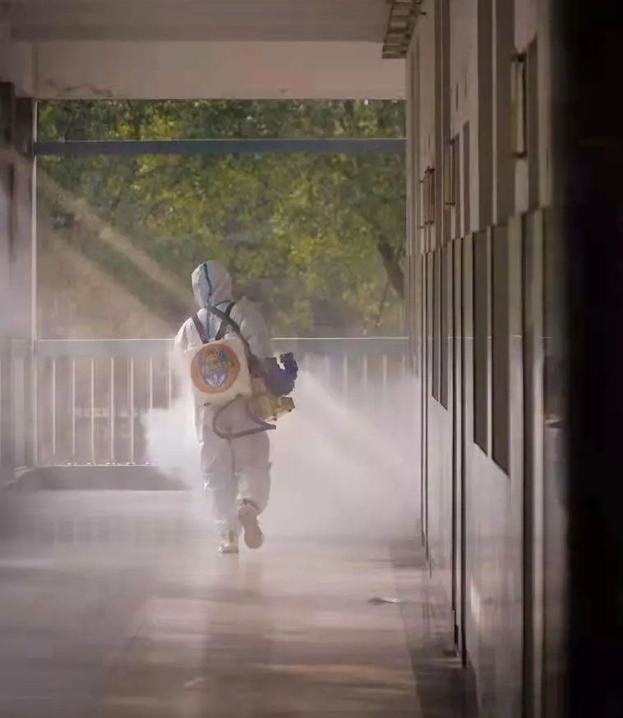 歲月靜好的背后是無(wú)數(shù)醫(yī)護(hù)人員的負(fù)重前行,平安開(kāi)學(xué)的也是先鋒隊(duì)員們負(fù)重消毒。他們?cè)诤L(fēng)中滿頭大汗,他們?cè)诤袣獯跤?,他們?cè)诎嘴F中負(fù)重前行,只為實(shí)現(xiàn)校園消毒清潔全覆蓋,只為提供校園的健康保障,只為把愛(ài)心與奉獻(xiàn)傳遞給每一個(gè)人。