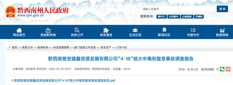 Recently, the People's Government of Qianxinan Prefecture in Guizhou Province released the "Investigation Report on the" 4.18 "Major Poisoning and Suffocation Accident of Qianxinan Pu'an Jianxin Resource Development Co., Ltd.".