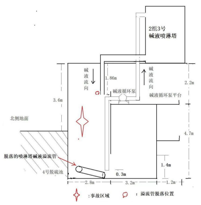 Jianxin Company decided to take shutdown insulation maintenance measures on April 18, 2023 at around 12:00 am due to the detachment of the lower part of the alkali overflow pipe of the No. 3 alkali spray tower in the No. 4 desulfurization tank of the old tower in the desulfurization workshop about a month before the accident (the diameter of the detached alkali overflow pipe was 63cm, the length was 4.74m, and the weight was 129.39kg). The desulfurization workshop also arranged for the desulfurization workshop staff to pump water from the No. 4 desulfurization tank of the old tower for maintenance.