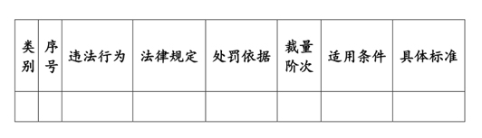 1.條文結(jié)構(gòu)。裁量細(xì)則分為六部分,即違法行為、法律規(guī)定、處罰依據(jù)、裁量階次、適用條件和具體標(biāo)準(zhǔn)。違法行為、法律規(guī)定和處罰依據(jù)主要援引法條的原文規(guī)定,依據(jù)法條的具體內(nèi)容對違法行為按不同標(biāo)準(zhǔn)進(jìn)行分級,確定裁量階次、適用條件和具體標(biāo)準(zhǔn)。具體格式如下: