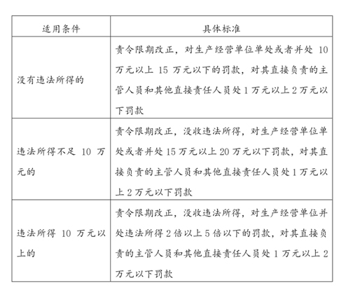 (2)投資額標(biāo)準(zhǔn)。例如安全生產(chǎn)法第九十八條規(guī)定依據(jù)投資額進(jìn)行裁量,裁量權(quán)基準(zhǔn)為: