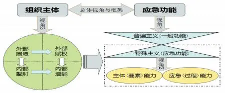 要對各類社會組織的功能作用、面臨的難題和能力建設(shè)進行分析,我們可以基于結(jié)構(gòu)功能主義的視角,構(gòu)建“組織主體-應急功能”的分析框架(如圖1),對社會組織作為一種應急主體的特色功能、內(nèi)在能力、內(nèi)外困境及其能力強化進行具體分析。結(jié)構(gòu)功能主義認為,結(jié)構(gòu)決定功能:結(jié)構(gòu)不同,功能則不同;反過來,功能發(fā)揮異常,必將反促結(jié)構(gòu)改進和優(yōu)化。[13](P321-323)這會涉及三個具體的分析(小)視角:第一,為了分析社會組織的功能特色,需要通過從社會組織一般性社會功能與特殊應急事務功能進行思考,從而觀測其在應急事務中的優(yōu)勢特色,即選取社會學上所謂“普遍主義-特殊主義”的關(guān)系視角;[14](P54-76)第二,為了分析社會組織內(nèi)在特有的應急能力結(jié)構(gòu),需要將其擬人化(人格化),即作為應急社會主體之一,它們在應急的各個環(huán)節(jié)中應該具備哪些基本的能力和特殊的能力。因此,需要建構(gòu)一種“主體能力-過程能力”的分析視角;第三,結(jié)合當代中國社會組織介入應急實踐的狀況,需要分析影響其應急行動和能力建設(shè)的內(nèi)外影響,從而可以建構(gòu)一種“外部賦權(quán)-內(nèi)部增能”的分析視角。這三個方面具有一定的邏輯演進關(guān)系,具體在后面各個部分論證闡述。