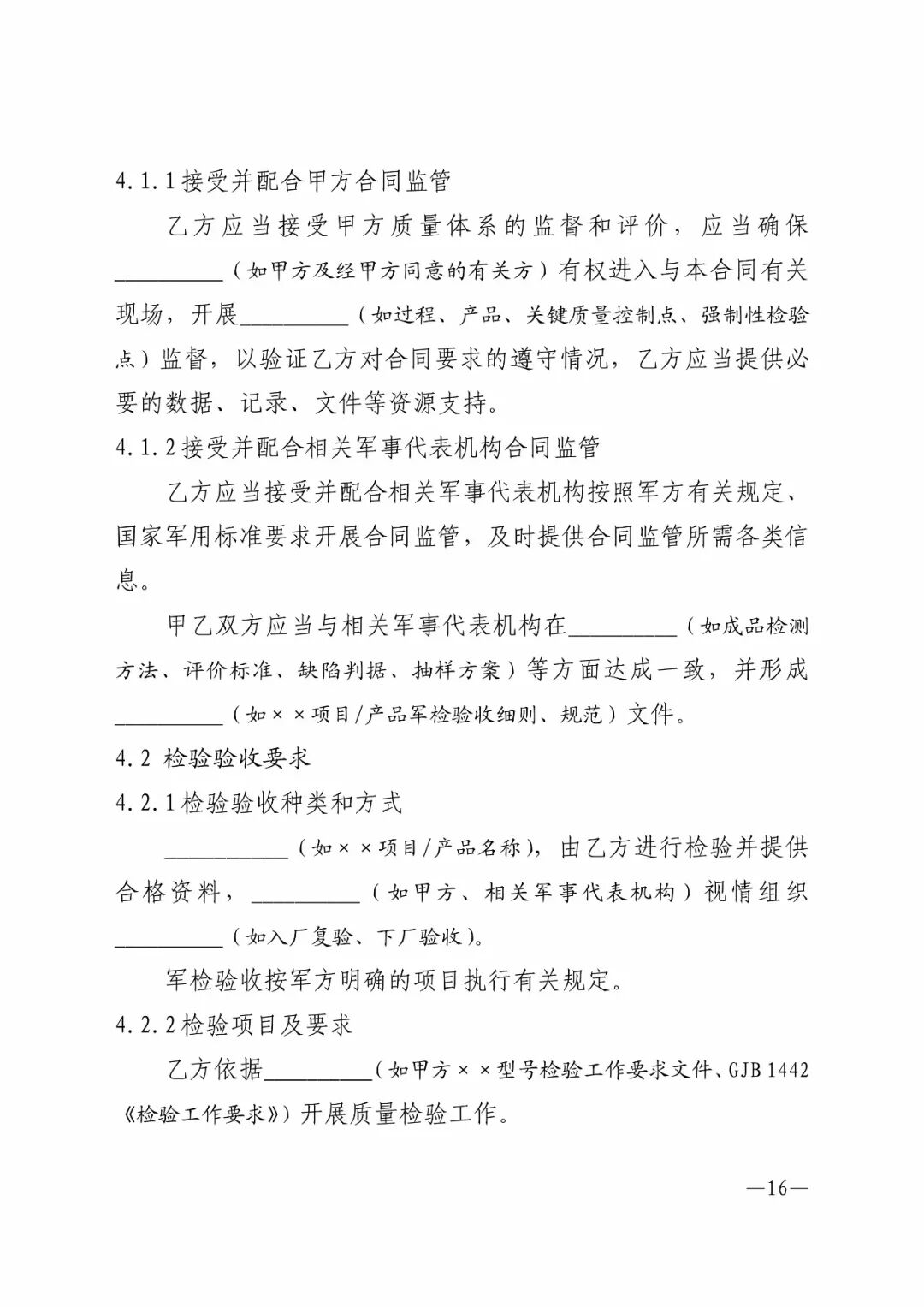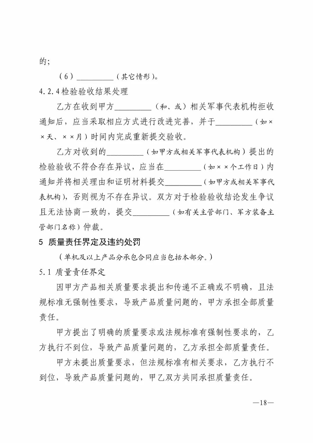 二、單機(jī)及以上裝備分承包合同應(yīng)當(dāng)包括《模板》所列各項(xiàng)質(zhì)量要求,確需調(diào)整、刪減的應(yīng)當(dāng)在合同中作出說(shuō)明,具體采用格式不作要求。軍工集團(tuán)有關(guān)業(yè)務(wù)主管部門、軍隊(duì)項(xiàng)目管理機(jī)構(gòu)或受其委托的軍事代表機(jī)構(gòu)負(fù)責(zé)監(jiān)督落實(shí)。