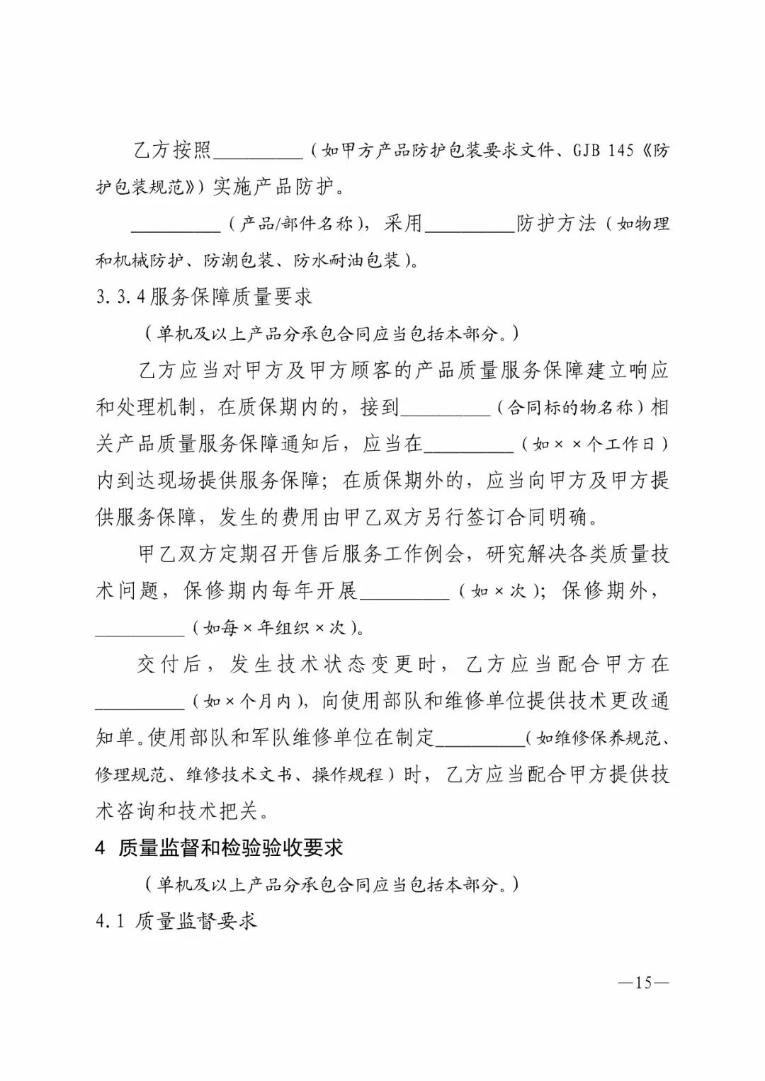為進(jìn)一步規(guī)范裝備分承包合同中的質(zhì)量要求,確保裝備研制生產(chǎn)供應(yīng)鏈中各層級(jí)裝備質(zhì)量要求有效傳遞,提高全供應(yīng)鏈質(zhì)量管理水平,促進(jìn)裝備質(zhì)量綜合提升,現(xiàn)將《裝備分承包合同質(zhì)量要求模板1.0版》(以下簡(jiǎn)稱《模板》)印發(fā)你們,請(qǐng)結(jié)合實(shí)際,認(rèn)真抓好貫徹落實(shí)。有關(guān)要求明確如下: