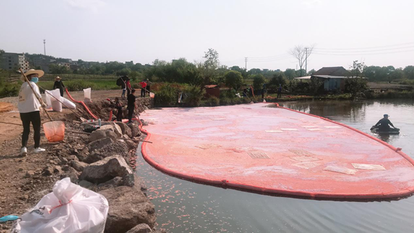 救援隊(duì)員們緊張而有序地開(kāi)展救治,采用一百多米長(zhǎng)具有自吸功能的物理吸附拖欄,先將魚(yú)塘大范圍水面溢油油漬圍堵起來(lái)。然后逐漸圍攏到便于操作的塘岸邊,往漂浮在水面的拖欄內(nèi),傾倒撒布,中翼公司生產(chǎn)的FG吸附夥粒。此時(shí)吸附顆粒在水中迅速趨向油污,白色顆粒吸飽了油污后變褐紅色。救援隊(duì)隊(duì)員站在岸邊,再用撈戽,將吸油顆粒撈起來(lái),裝入回收袋上岸的吸油顆粒,無(wú)糊狀油漬及水滲出,運(yùn)回公司進(jìn)行處理。用了7個(gè)多小時(shí)連續(xù)作業(yè),魚(yú)塘清污工作于下午17點(diǎn)勝利結(jié)束。將魚(yú)塘里的油漬全部物理吸附。視覺(jué)觀察水面沒(méi)有油漬膜存在了。塘里的水也相當(dāng)于做了一次凈化。沒(méi)有受到油污的不良影響,魚(yú)兒歡快地躍出水面,此次救援活動(dòng),保護(hù)了約六畝魚(yú)塘水域環(huán)境及魚(yú)類(lèi)。
