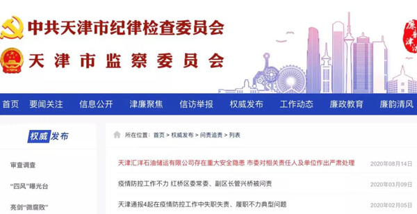 8日16時(shí)許,國(guó)務(wù)院安委辦檢查組當(dāng)場(chǎng)將天津匯洋石油儲(chǔ)運(yùn)有限公司管理存在重大隱患一案交當(dāng)?shù)卣块T處理。17時(shí),天津市港航管理局已將執(zhí)法文書下達(dá)至該企業(yè),責(zé)令該企業(yè)停產(chǎn)停業(yè),立刻整改。18時(shí),天津市政府相關(guān)部門舉一反三,部署了整改行動(dòng)。20時(shí),天津市港航管理局、應(yīng)急管理局聯(lián)合召集南疆石化小區(qū)各石油儲(chǔ)運(yùn)企業(yè)主要負(fù)責(zé)人進(jìn)行約談。