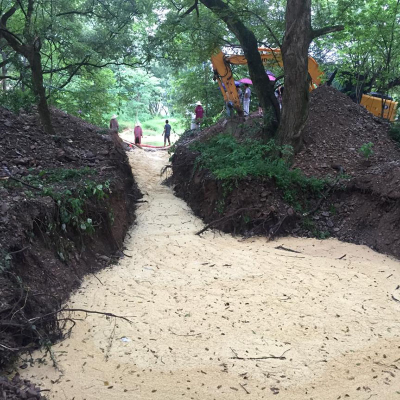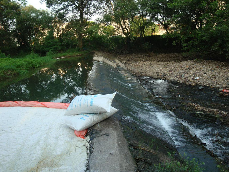 3.在河灘邊開挖引流渠、蓄污池,將吸附劑引流到池內(nèi)后再打撈,預(yù)防、化解暴雨山洪來襲,油污泄流下游風(fēng)險。